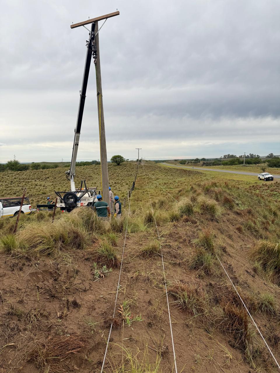 Se sigue trabajando en la línea troncal de media tensión en 13.200 volts que alimenta a las zonas rurales de las localidades de Padre Buodo, Colonia Santa María, Unanue y Perú con postes de eucaliptus quebrados y cables cortados.